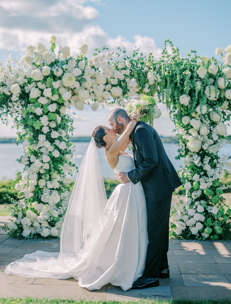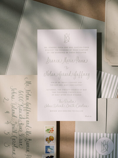 Classic elegance meets coastal charm for Evan and Alexa. Dreamy neutrals, a classic ticking stripe pattern, green accents, and lobster cut cards brought their paper details to life for their Newport, Rhode Island wedding day.