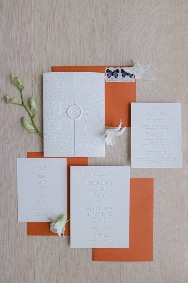 Kim and Matt's chic Miami wedding day. For their paper details, we kept things elegant and understated yet impactful, with a bold orange envelope, embossed palm leaves fit for the location, and neutral letterpress printing.